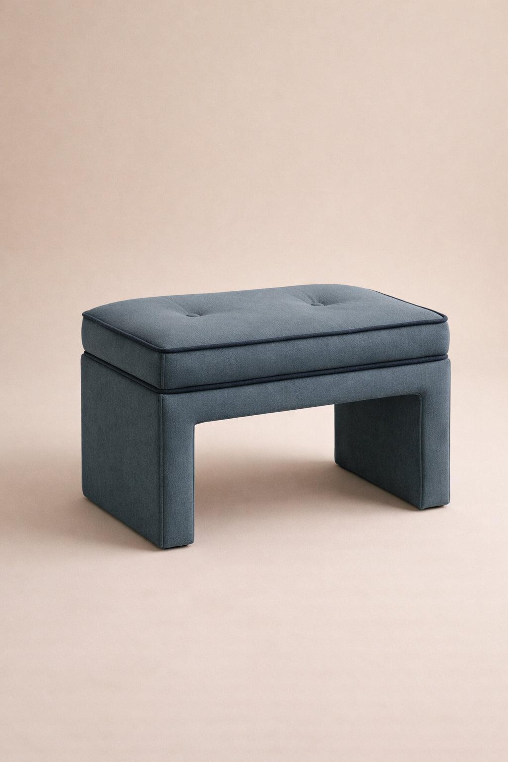 Designed with compact spaces in mind, The Arc Stool is an adaptable piece suited to dressing rooms, bedrooms or quiet corners. A plush upholstered seat is finished with two button details and a tailored piping edge, giving the stool a refined but practical character.