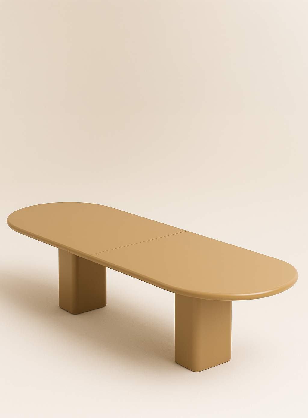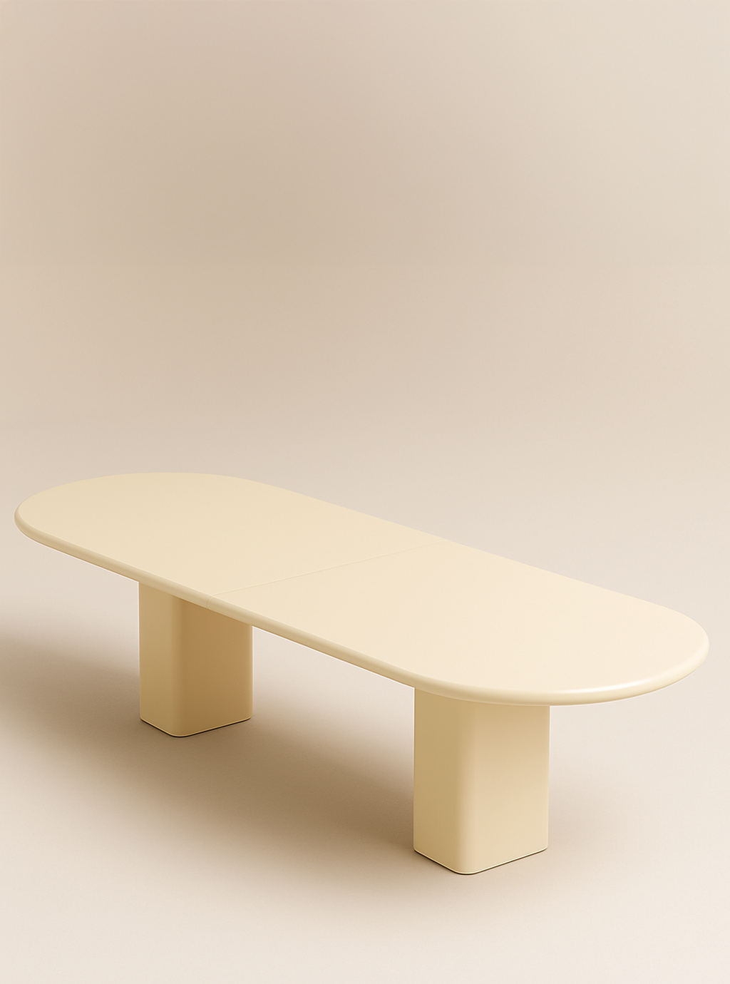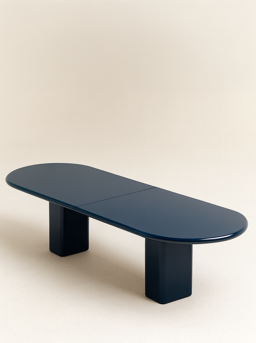 This generous dining table is defined by its smooth, monolithic silhouette and soft, sculptural edges. The high-gloss lacquer finish gives depth and luminosity to the chosen hue, while the two solid column bases provide a grounded, architectural presence.