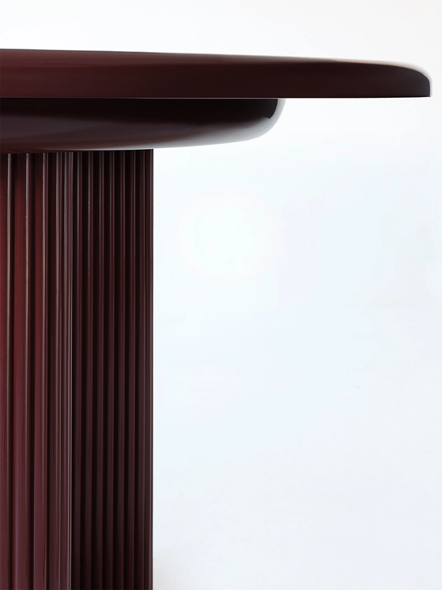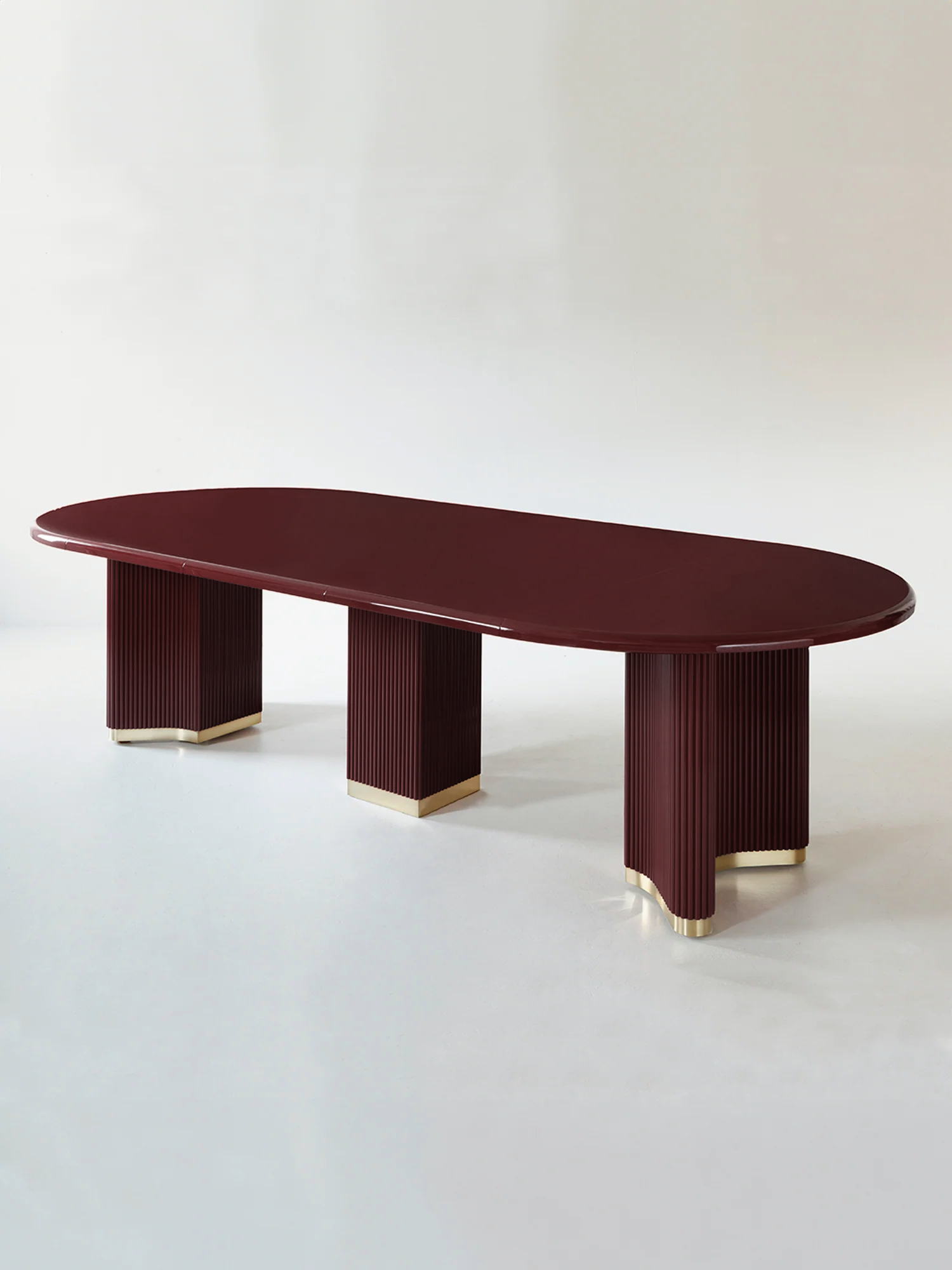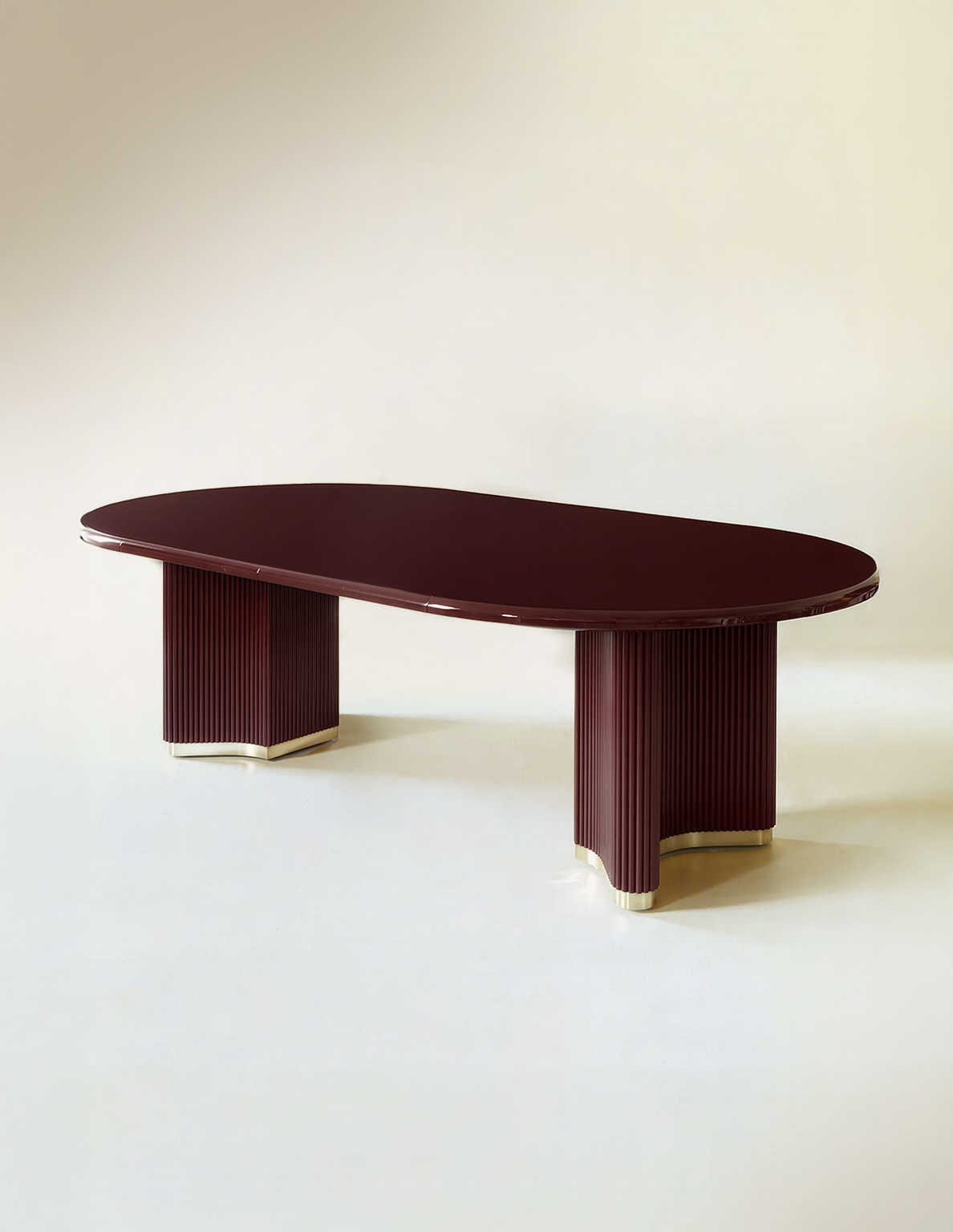 A sculptural dining table defined by its bold form and refined detailing. The ribbed timber legs, finished in deep red lacquer, sit on a polished brass plinth. The high-gloss lacquered tabletop is smooth to the touch, with softly rounded edges that mirror the fluted base.