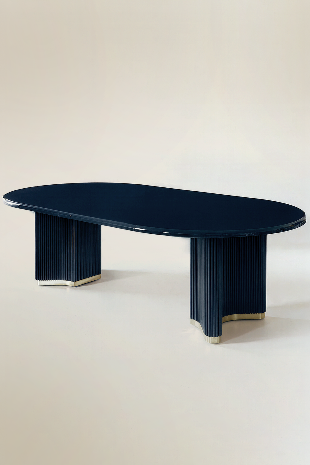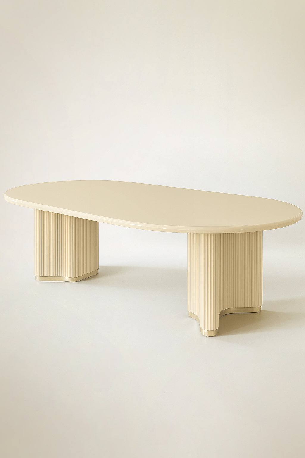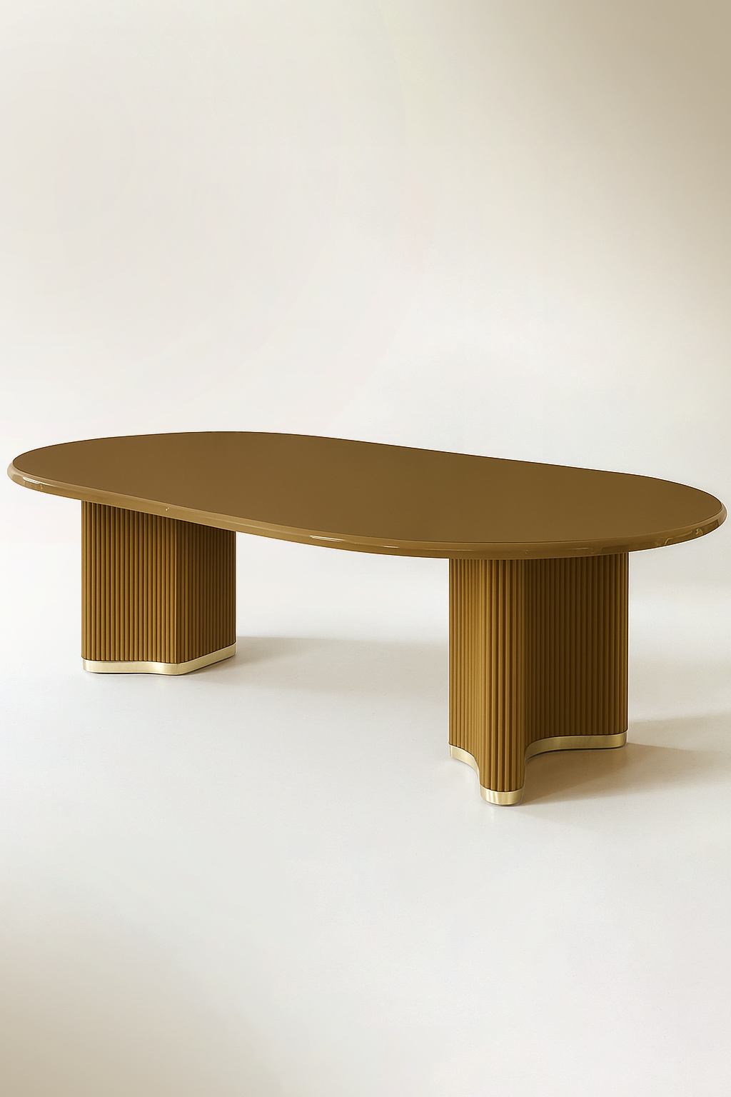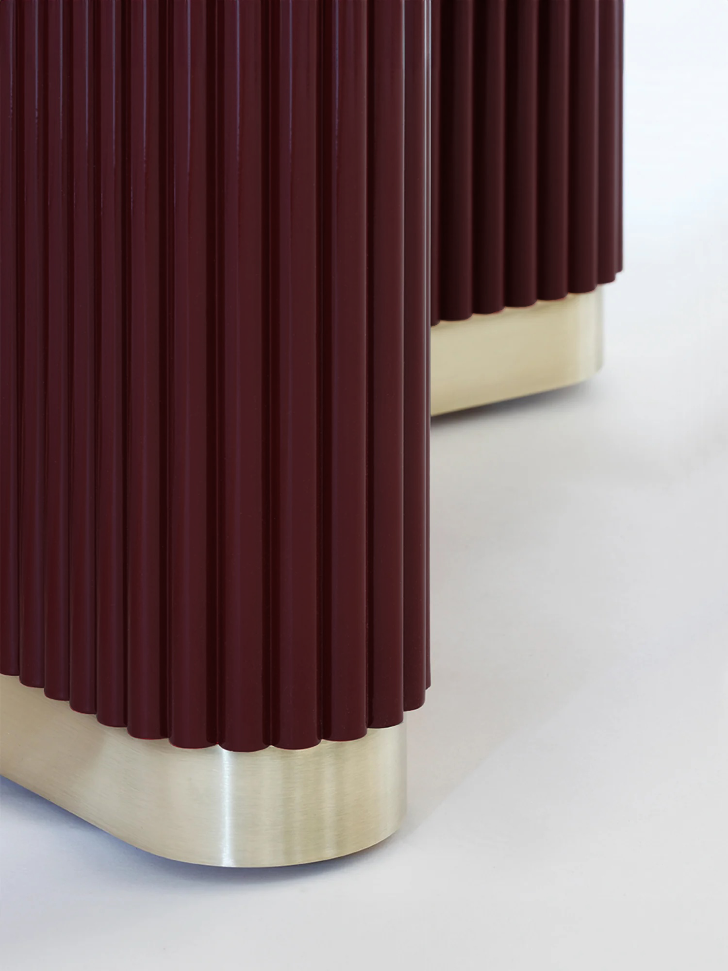 A sculptural dining table defined by its bold form and refined detailing. The ribbed timber legs, finished in deep red lacquer, sit on a polished brass plinth. The high-gloss lacquered tabletop is smooth to the touch, with softly rounded edges that mirror the fluted base.