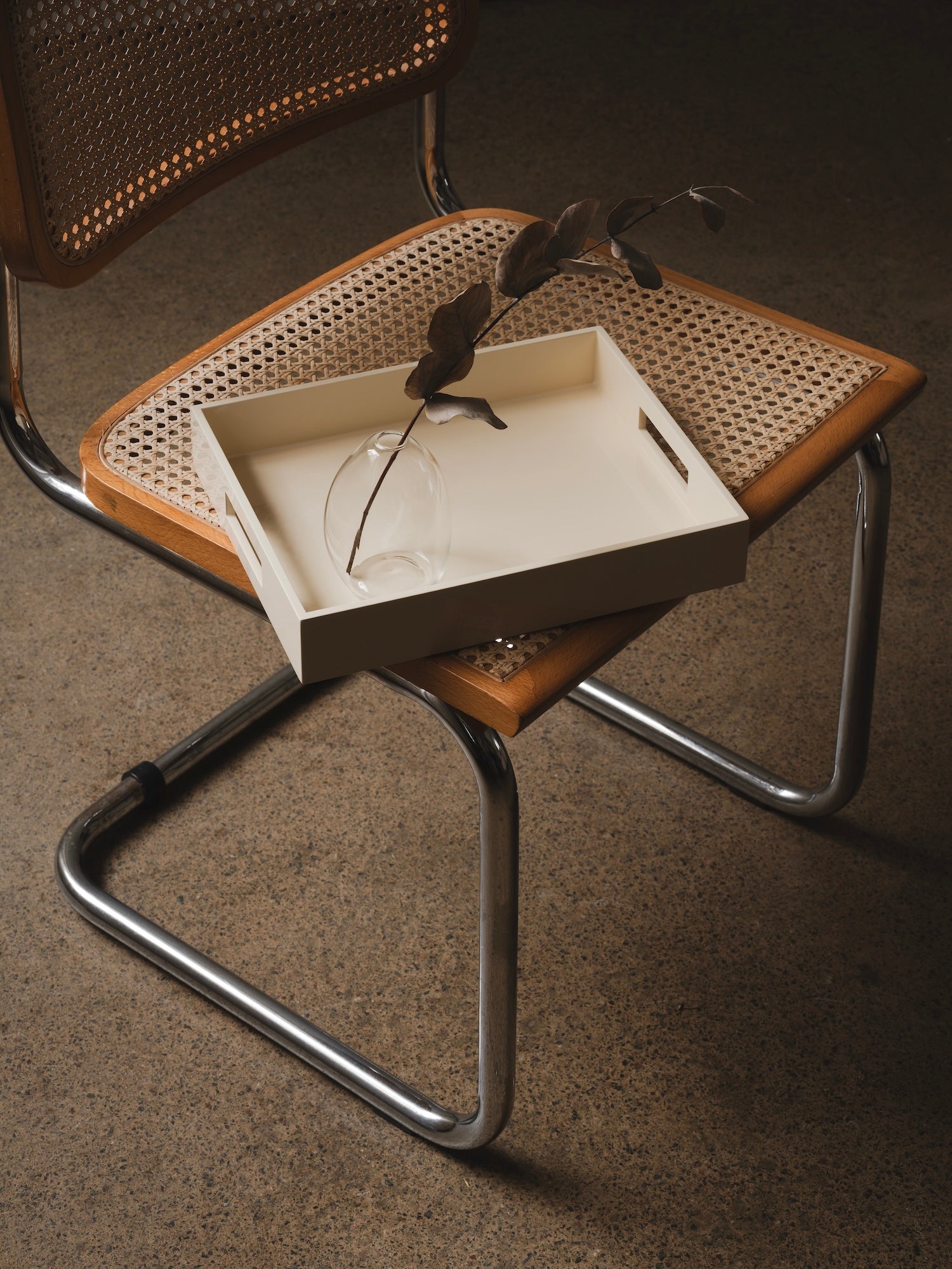 A refined rectangular tray in high-gloss lacquer, defined by its clean lines, sharp edges, and integrated side handles. Offered in a curated palette of saturated hues, its polished surface catches and reflects the light with subtle brilliance.